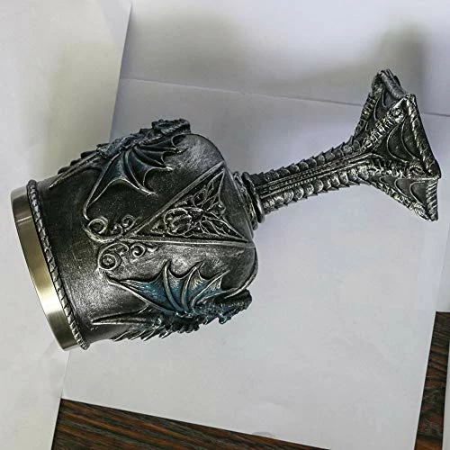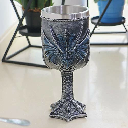- β MYSTICAL BLUE DRAGON GOBLET – This Dragon Wine Chalice is 8.2 “tall, 3.5” in diameter and outside is entirely made of thick high quality resin, inner stainless steel cup, as big as a mug, can hold up to 14 ounces of your favorite beverage. It works well for drinking beer, wine, coffee, milk or teas