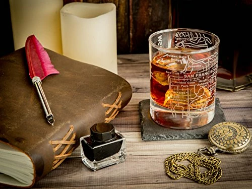 - SAND ETCHED WHISKEY TUMBLER: Each Greenline Goods rocks whisky glass was etched by a skilled artisan and features a hand drawn street grid with map coordinates. Glass sets are carefully packed in an elegant gift box and chosen to make a lasting impression!
