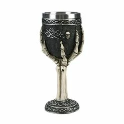- γDrink in Style γ This spooky wine goblet features a skeleton hand rising from the grave grasping the body of the wine goblet. Around the rim of the goblet are skull heads to bestow the power of death and hell to all who drinks out of the chalice. Drink in style with this ossuary ghastly skull goblet.