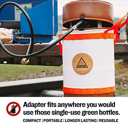 The Ignik Gas Growler X is a 10-pound refillable propane tank with an included carrying case and adapter hose for fueling camp stoves, grills, heaters, and fire pits. Ideal for situations that require require portability, or when space is limited, such as camping, RVing, boating, fishing, tailgating, and overlanding, the Growler can connect to most types of propane-burning devices. The 10-lb (2.5-gallon) tank stores 10 times the fuel of single-use green bottles, and is easily refillable at any propane service station, saving money and sparing the landfill from another 10 bottles. Perfect for long weekends, or leisurely time spent around a fire pit, the Gas Growler X has enough capacity for extended burn time, while still easily portable in its rugged, insulated carrying case with removable handle and MOLLE webbing loops. The included adapter hose fits 1-inch 20UNEF connectors, which includes many popular 2-burner camp stoves, as well as 0.5-inch QCC1/OPD compatible products such as standard home BBQ grills. DOT-approved for safe transport, the growler measures 9.8 x 9.8 x 18.5 inches and weighs 16.5 pounds when empty.