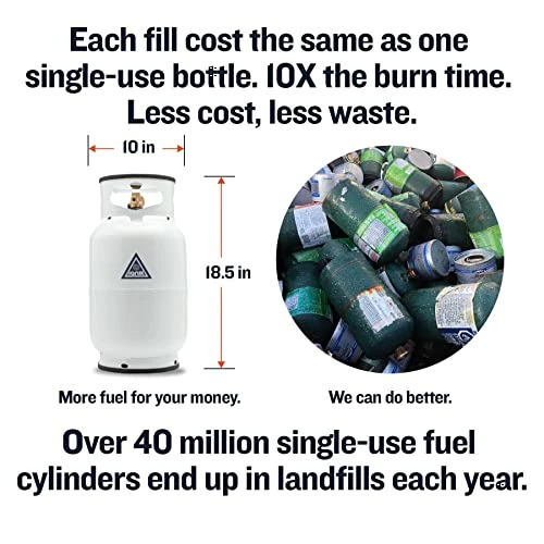 - Tank stores 10 times the fuel of single-use green bottles, and is easily refillable at any propane service station, for a more economical, less-wasteful fueling option