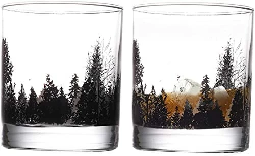 - ?Etched Whiskey Glass with Printed Forest Landscape: Handmade printed screen detailed illustration of a black and white forest landscape. It brings you a shocking scenery when you enjoy your whiskey. The ink will not fade away or wash off. We recommend washing by hand.